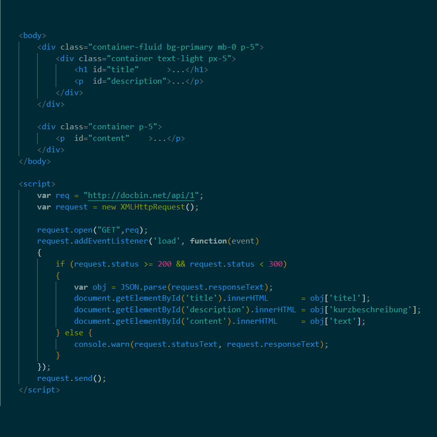 Mit diesem kleinen Demo-JavaScript können Sie die API von BitBin in Ihrer eigenen HTML-Webseite oder jedem beliebigen Content Management System testen. Sie erhalten einen JSON-Stream des ersten Beitrags der Datenbank.