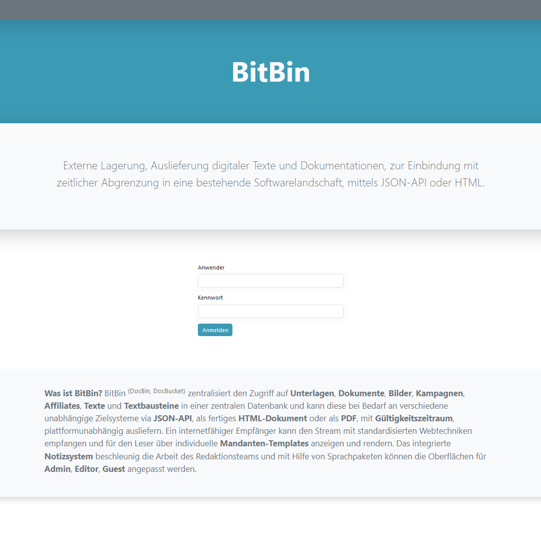 Was ist BitBin? BitBin (auch: DocBin, DocBucket) zentralisiert den Zugriff auf Unterlagen, Dokumente, Bilder, Kampagnen, Affiliates, Texte und Textbausteine in einer zentralen Datenbank und kann diese bei Bedarf an verschiedene unabhängige Zielsysteme via JSON-API, als fertiges HTML-Dokument oder als PDF, mit Gültigkeitszeitraum, plattformunabhängig ausliefern. Ein internetfähiger Empfänger (Smartphone, Tablet, PC Web-Browser, IoT-Devices,...) kann den Stream mit standardisierten Webtechniken empfangen und für den Leser über individuelle Mandanten-Templates anzeigen und rendern. Das integrierte Notizsystem beschleunig die Arbeit des Redaktionsteams und mit Hilfe von Sprachpaketen können die Oberflächen für Admin, Editor, Guest angepasst werden. Zudem kann mit der Funktion missing Help ermittelt werden, welche eingehenden Requests noch kein zugeordnetes Dokument besitzen, um dieses so schnell als möglich durch einen Redakteur erstellen zu lassen.