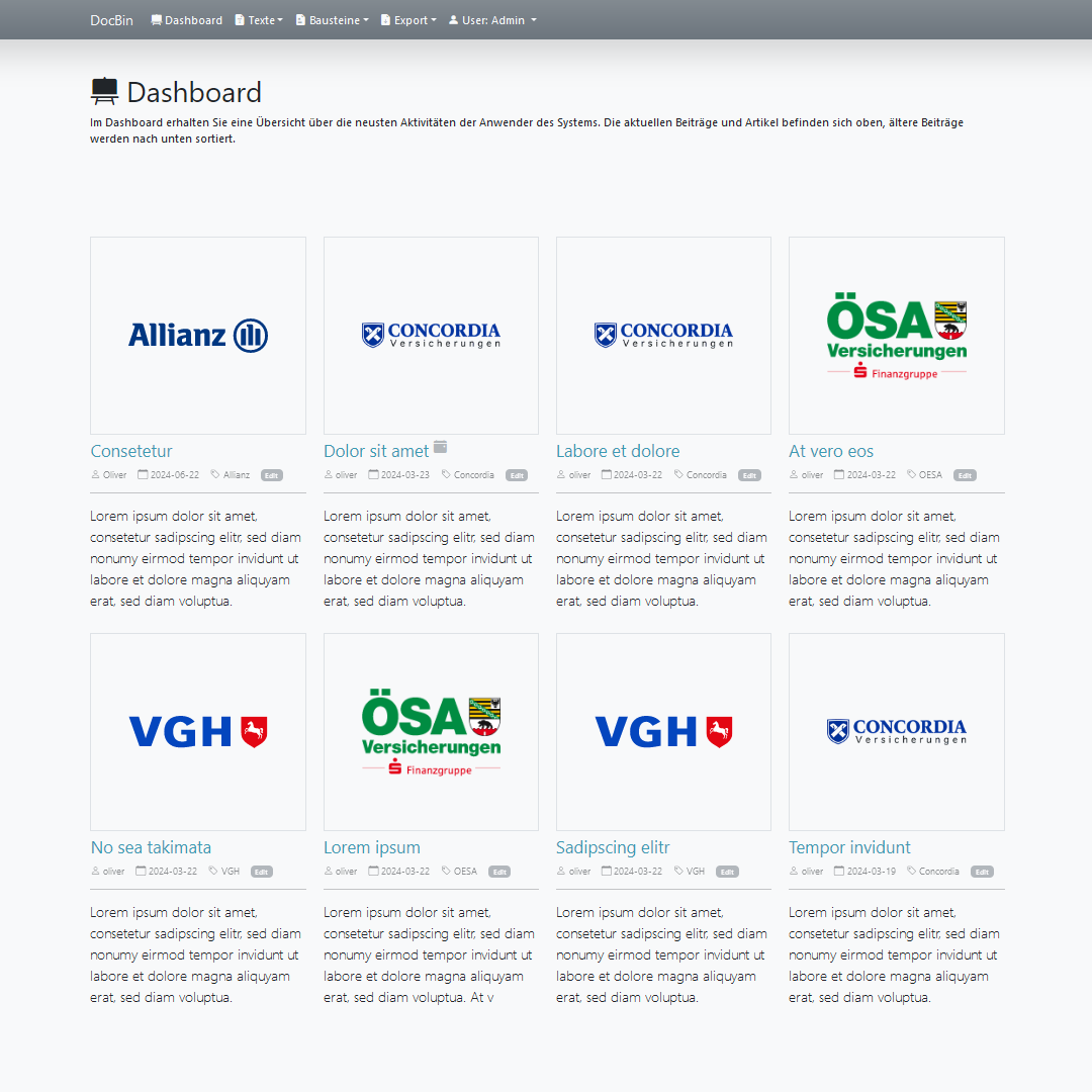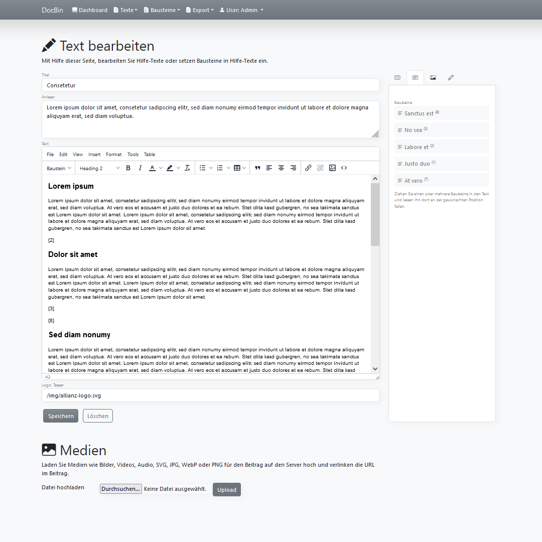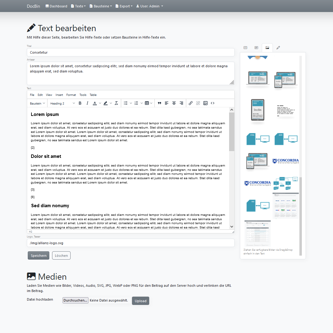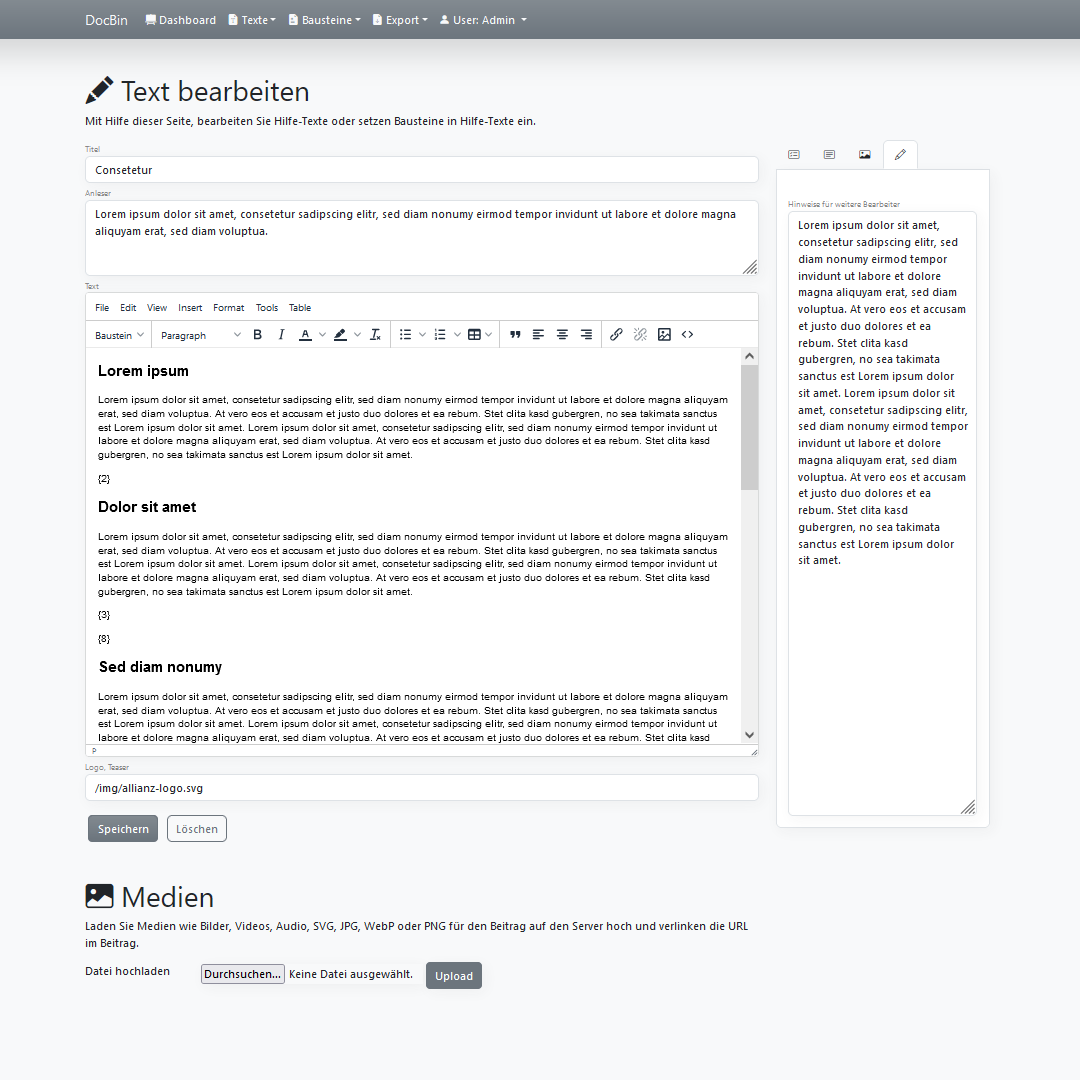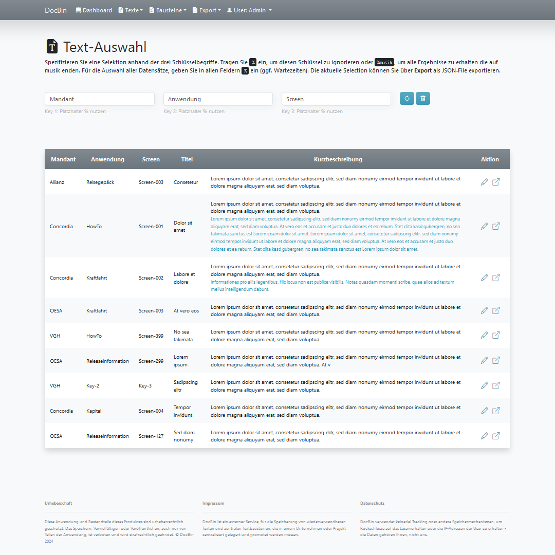 DocBin ist ein externer Service, für die Speicherung von wiederverwendbaren Texten und zentralen Textbausteinen, die in einem Unternehmen oder Projekt zentralisiert gelagert und promotet werden müssen.
